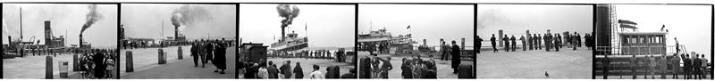 [People waiting on the dock of the Hoboken Ferry Terminal.]
