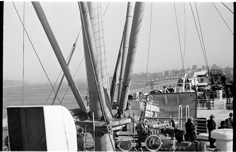 [Deck of ship with a view of the Manhattan skyline.]