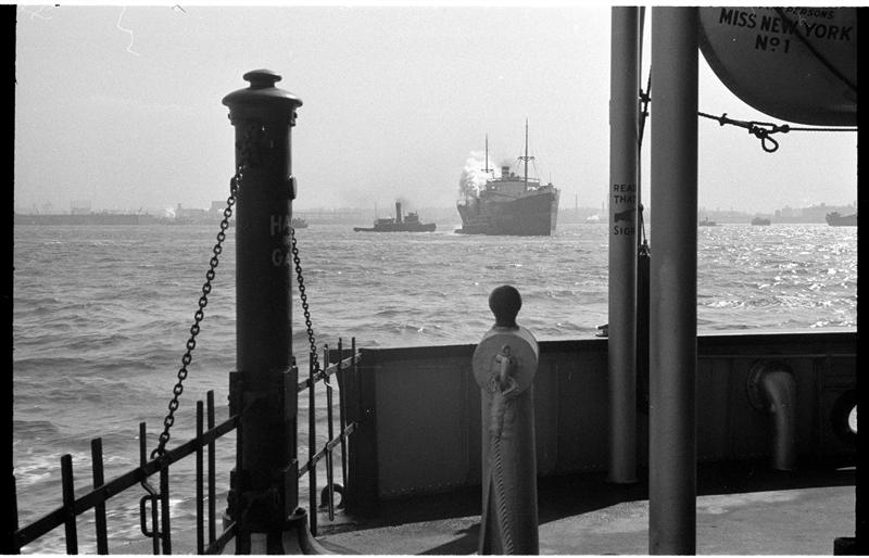 [Views of New York Harbor and double exposure of ferryboat with unidentified image.]