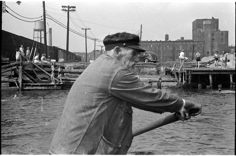 [People relaxing and swimming at the waterfront and man rowing boat.]