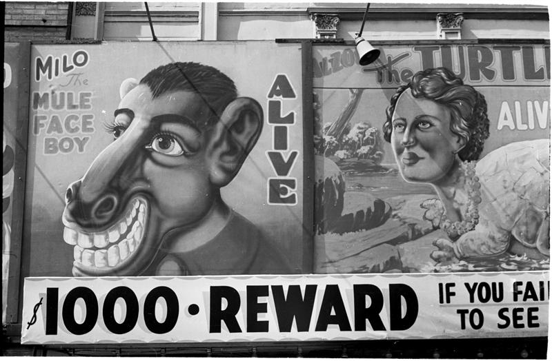 [Coney Island sideshow sign advertising Milo the Mule Face Boy and Gloria Snake Enchantress.]