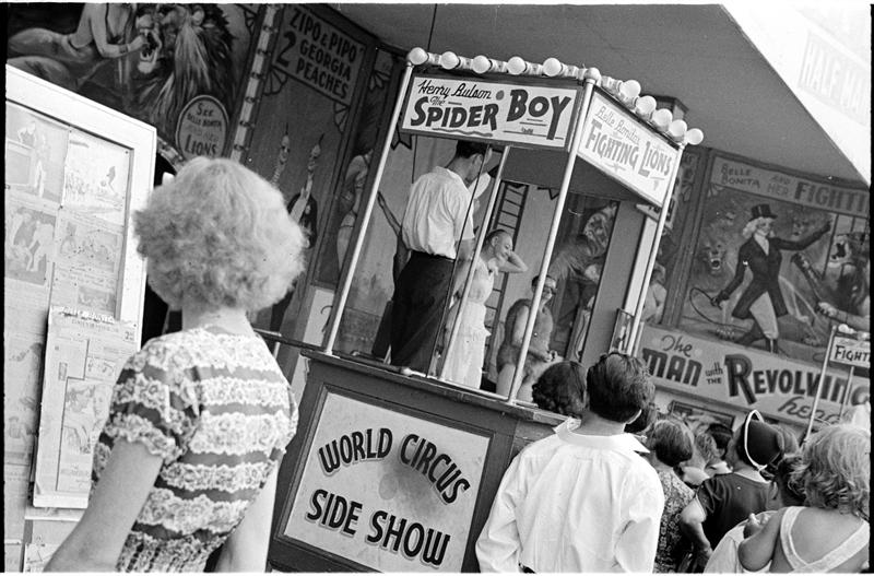 [Sideshow talker pointing to sign advertising Elma Von Lynd, the 3 Legged Girl.]