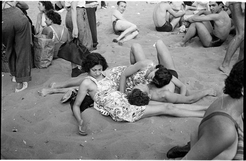 [People relaxing on Coney Island beach.]