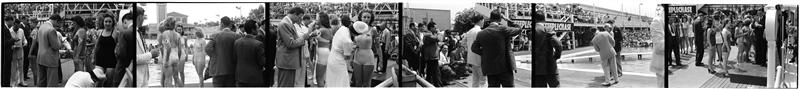 [Woman measuring beauty contestant's waist at Modern Venus Contest.]