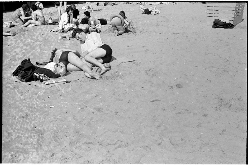 [People relaxing on the beach at Coney Island.]