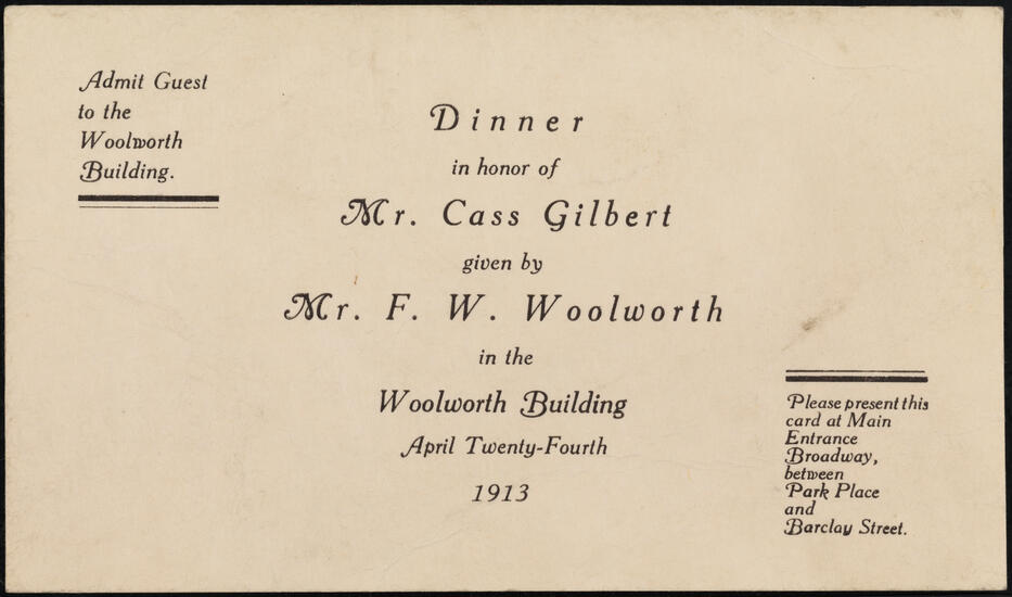 [Dinner in honor of Mr. Cass Gilbert hosted by Mr. F. W. Woolworth]