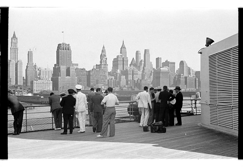 [Men hanging out on deck of ship with view of Manhattan skyline.]