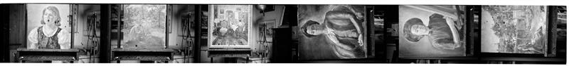[Felicia Marsh standing next to paintings by Reginald Marsh.]