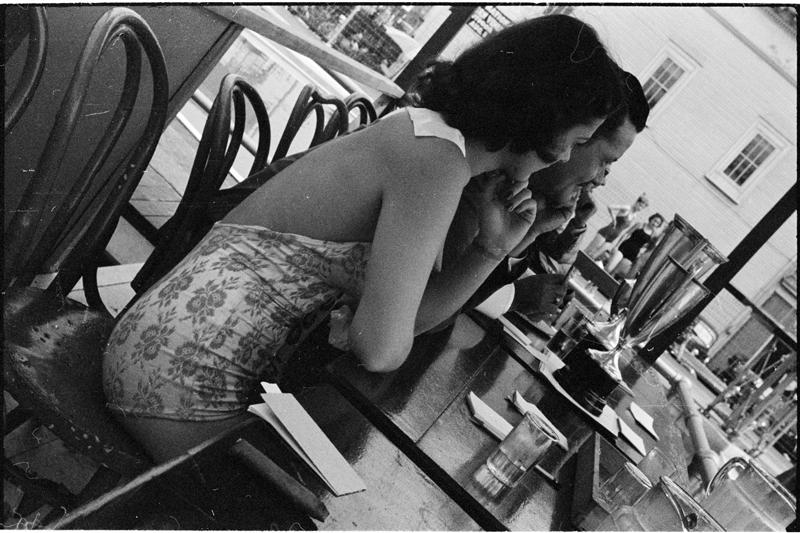 [Woman measuring beauty contestant's waist at Modern Venus Contest.]