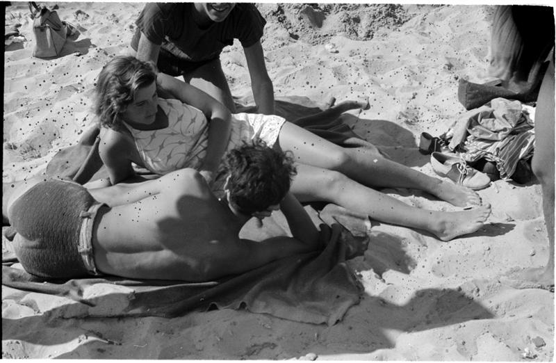 [Teenagers relaxing on Coney Island beach.]