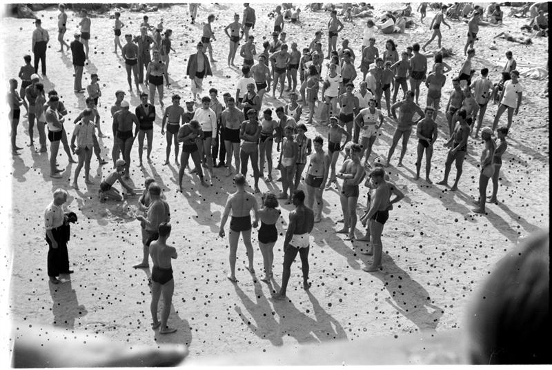 [Crowd gathered around lifeguard stand on Coney Island beach.]