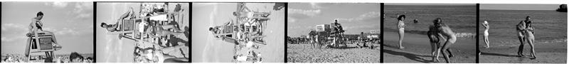 [Crowd gathered around lifeguard stand on Coney Island beach.]