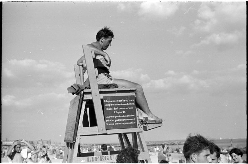 [Crowd gathered around lifeguard stand on Coney Island beach.]