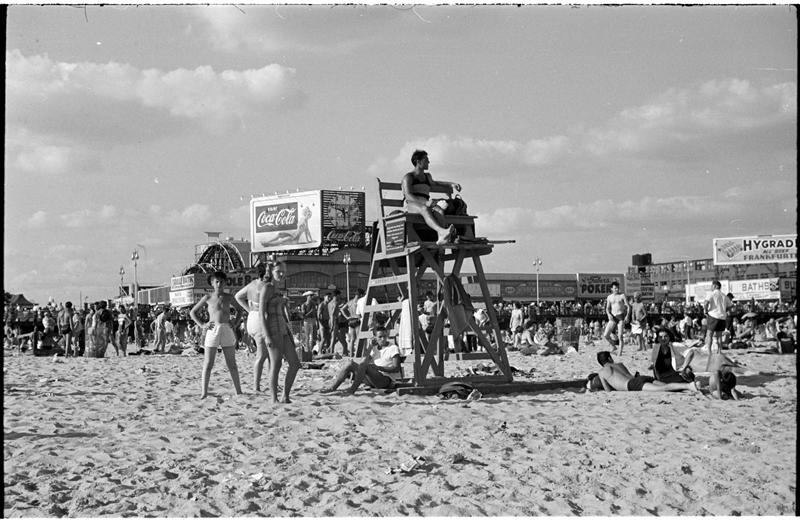 [Crowd gathered around lifeguard stand on Coney Island beach.]