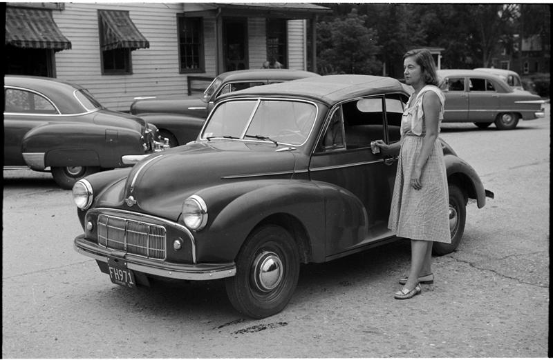 [Felicia Marsh and unidentified woman standing next to car on dirt road.]
