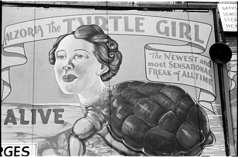 [Coney Island sideshow sign advertising Alzoria the Turtle Girl.]