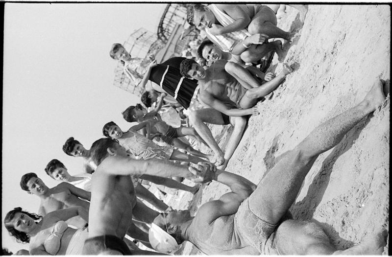[Teenagers performing stunt on Coney Island beach.]