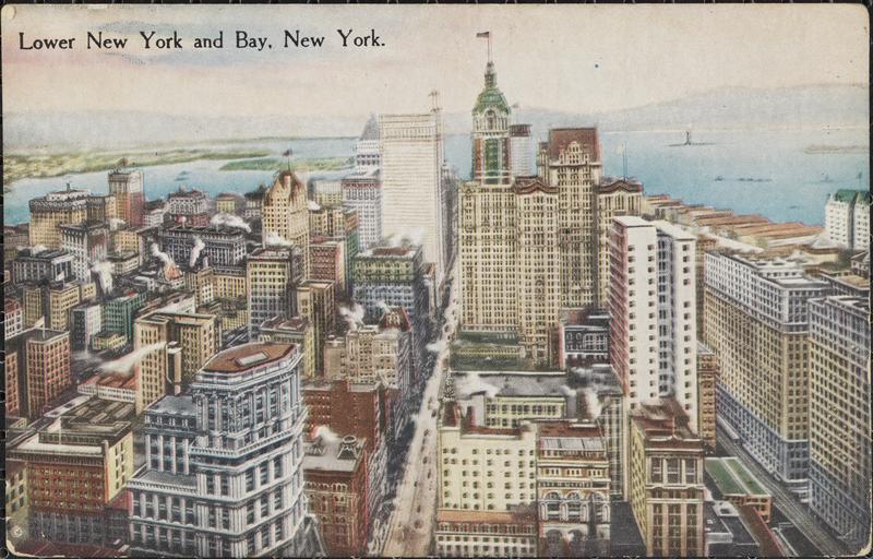 Panorama of Lower Manhattan and Bay from top of Woolworth Building, New York City.