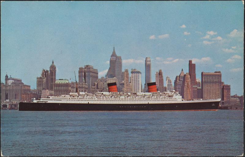 Queen Mary against Lower Manhattan skyline.;