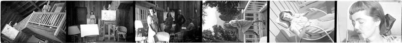 [Felicia Marsh standing next to paintings by Reginald Marsh.]
