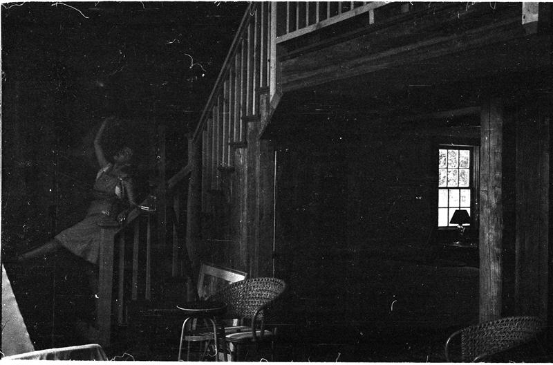 [Felicia Marsh standing next to paintings by Reginald Marsh.]