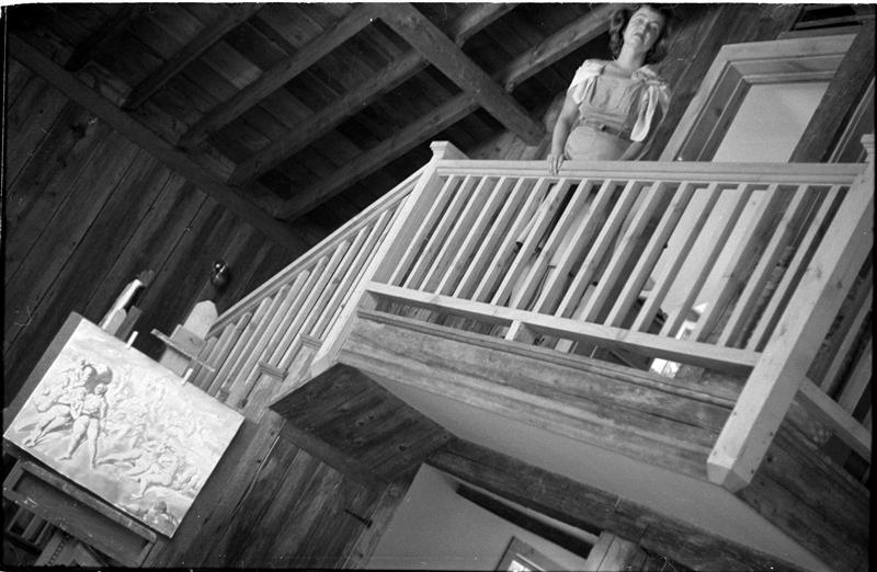 [Felicia Marsh standing next to paintings by Reginald Marsh.]