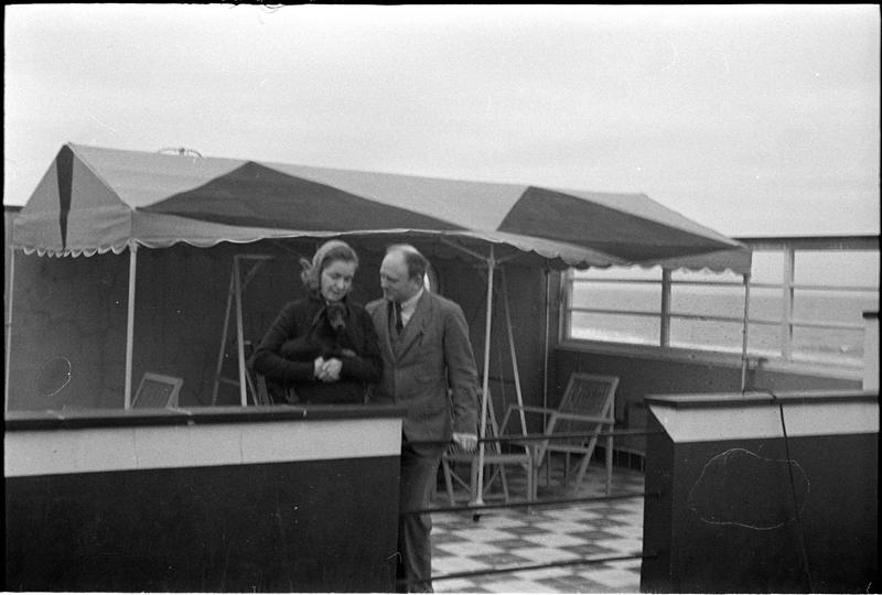 [Felicia and Reginald Marsh on deck of Fred Dana Marsh's "Battleship" house in Ormond Beach, Florida.]