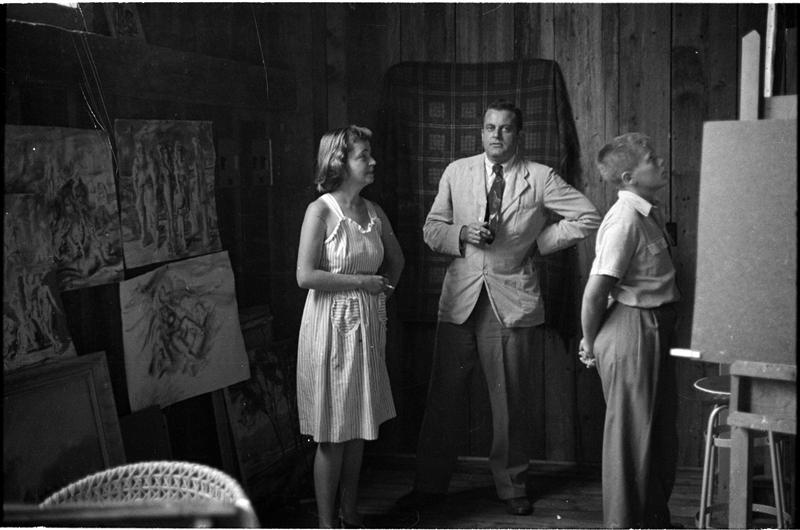 [Felicia Marsh standing next to paintings by Reginald Marsh.]