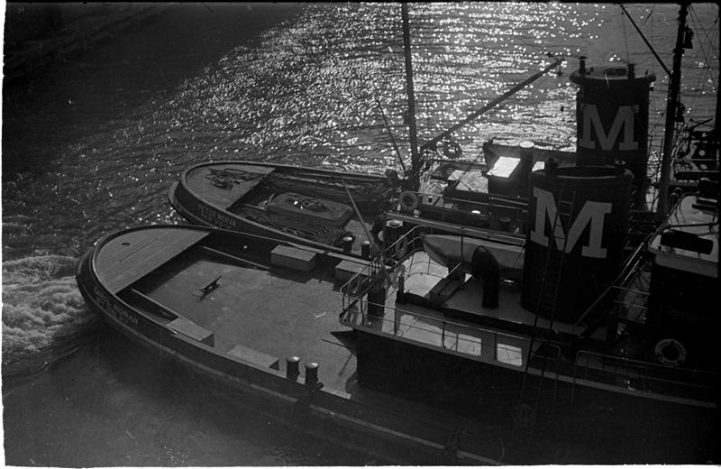 [Travelers on deck of ship looking at Carol Moran and Peter Moran tugboats.]
