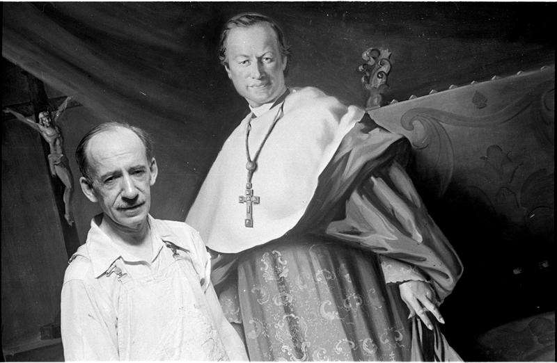 [Man standing next to two paintings of Roman Catholic clergy.]