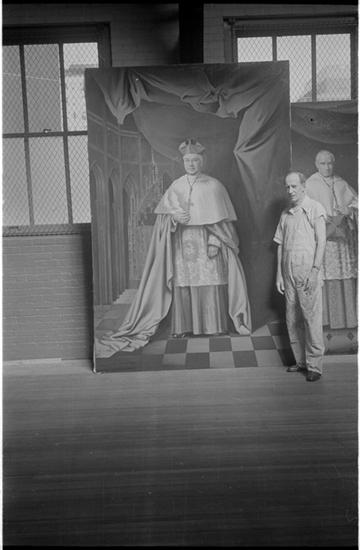 [Man standing next to two full-length portraits of Roman Catholic clergy.]