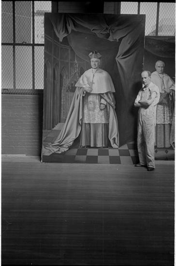 [Man standing next to painting of Michael Augustine Corrigan, Archbishop of New York.]
