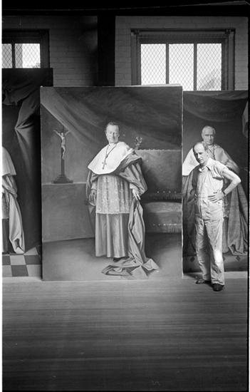 [Man standing next to painting of Michael Augustine Corrigan, Archbishop of New York.]