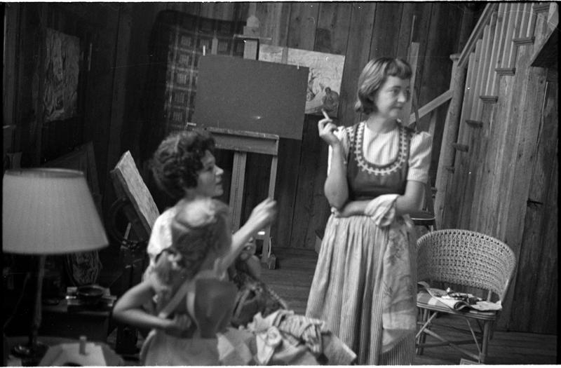 [Felicia Marsh standing next to paintings by Reginald Marsh.]
