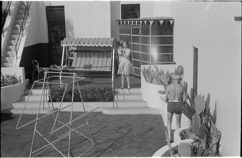 [Felicia Marsh on terrace of Fred Dana Marsh's "Battleship" house in Ormond Beach, Florida.]