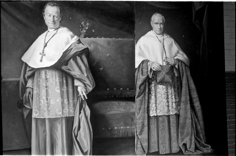 [Man standing next to two full-length portraits of Roman Catholic clergy.]