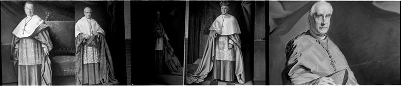 [Man standing next to two full-length portraits of Roman Catholic clergy.]