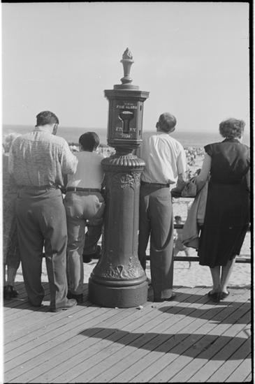 [People relaxing under the shade of the Coney Island boardwalk.]