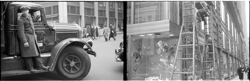 [Man leaning outside of window, with watercolor of Bowery scene to his right.]