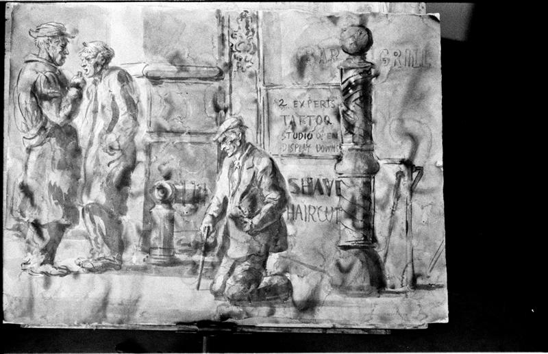 [Signed painting of destitute men on the Bowery by Reginald Marsh.]