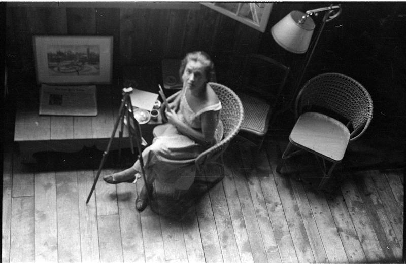 [Felicia Marsh painting near country home.]