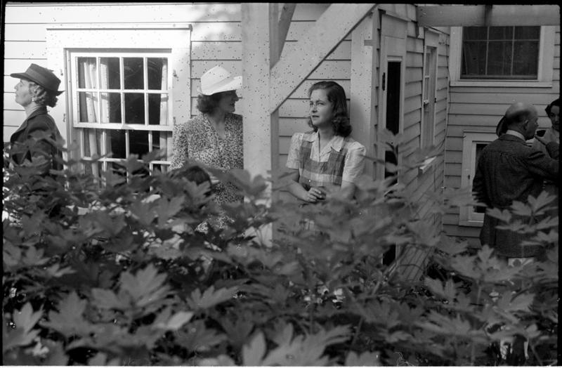 [Felicia Marsh and unidentified people socializing in garden.]