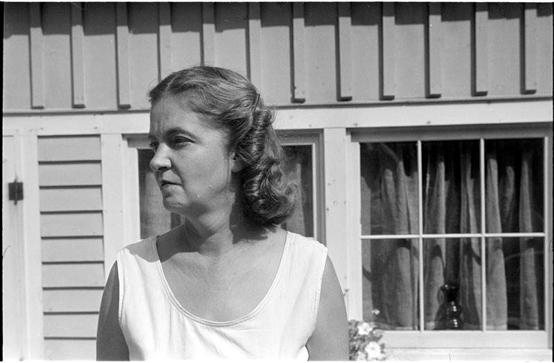 [Felicia Marsh with unidentified man and woman outside of house.]