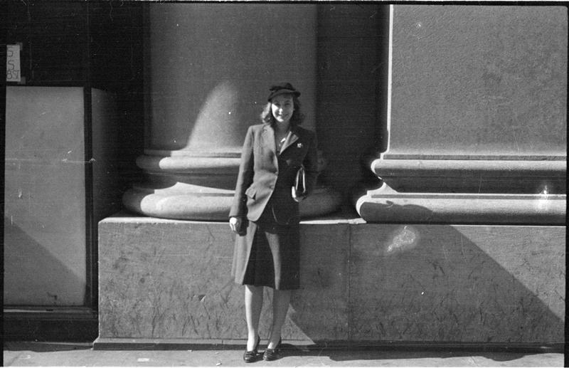 [Unidentified woman standing outside of Walgreen Drugs.]