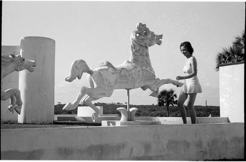 [Felicia Marsh standing next to carousel horse at Fred Dana Marsh's "Battleship" house in Ormond Beach, Florida.]