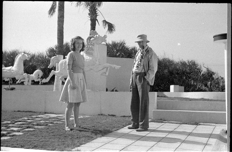 [Felicia Marsh and unidentified man at Fred Dana Marsh's "Battleship" house in Ormond Beach, Florida.]
