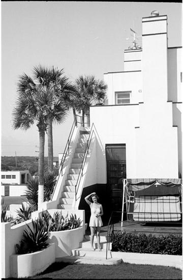 [Felicia Marsh standing on terrace of Fred Dana Marsh's "Battleship" house in Ormond Beach, Florida.]