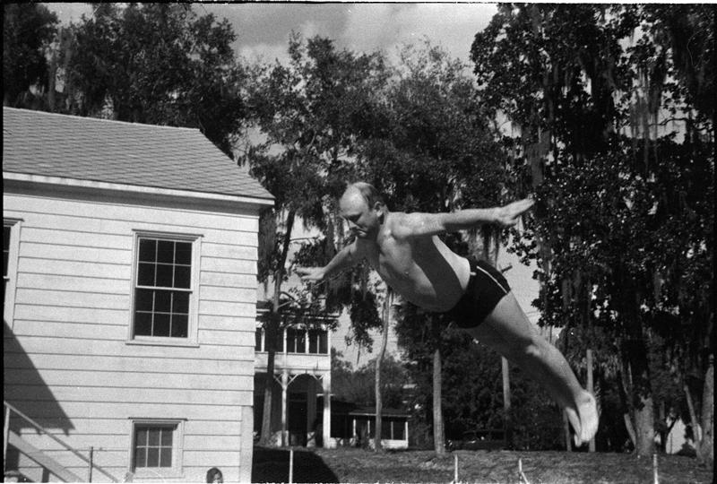 [Reginald Marsh and unidentified man surveying landscape outside of house.]