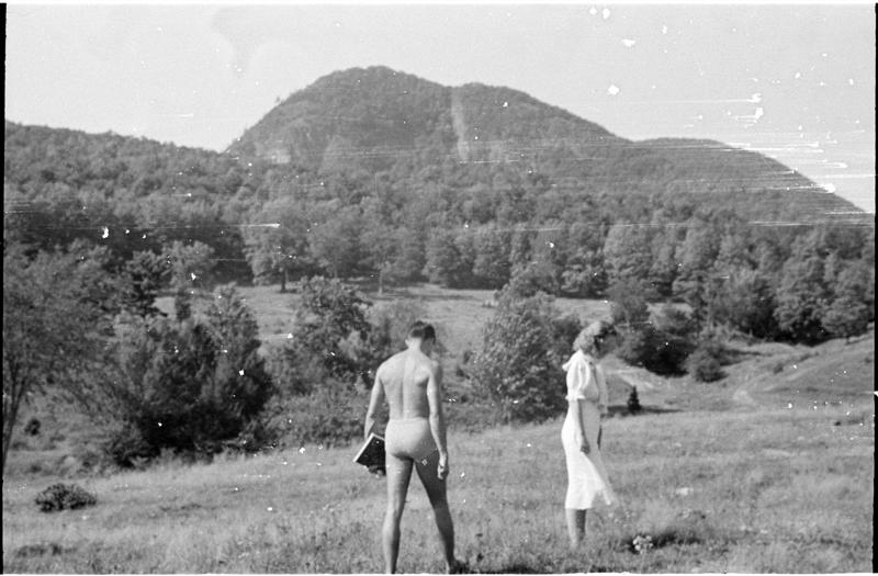 [Felicia Marsh leaning on fence with two unidentified men.]