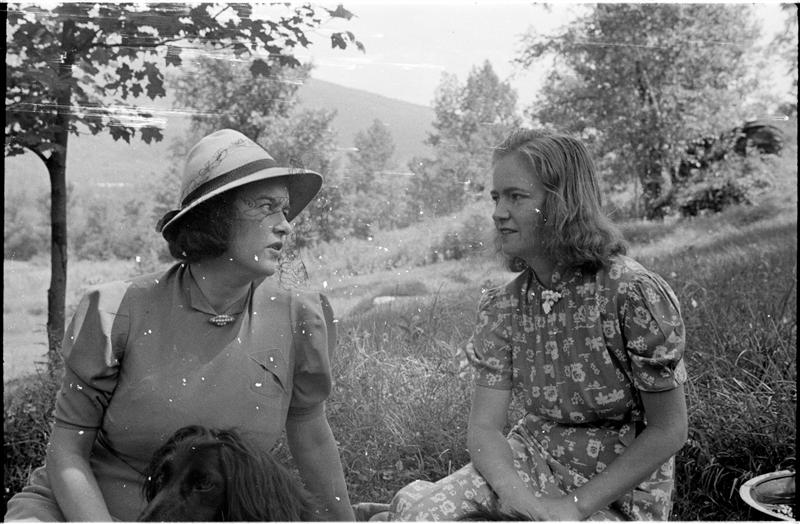 [Felicia Marsh and unidentified woman sitting in garden.]